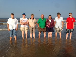 We then made out way to the beach. Some of us went into Mablethorpe itself, while another group went to Huttoft Bank. A delicious fish and chip supper was served, and we went for a little paddle and a game of boules on Mablethorpe sands, meanwhile a knobbly knees competition and water fight were had at Huttoft beach, along with another game of boules which Gill won. This was then followed by a very exciting cricket match, umpired by John from behind the newspaper, and won by Sylvia by a spectacular 8 runs!